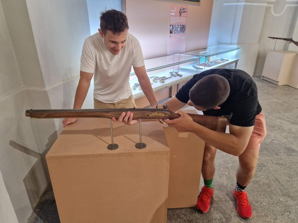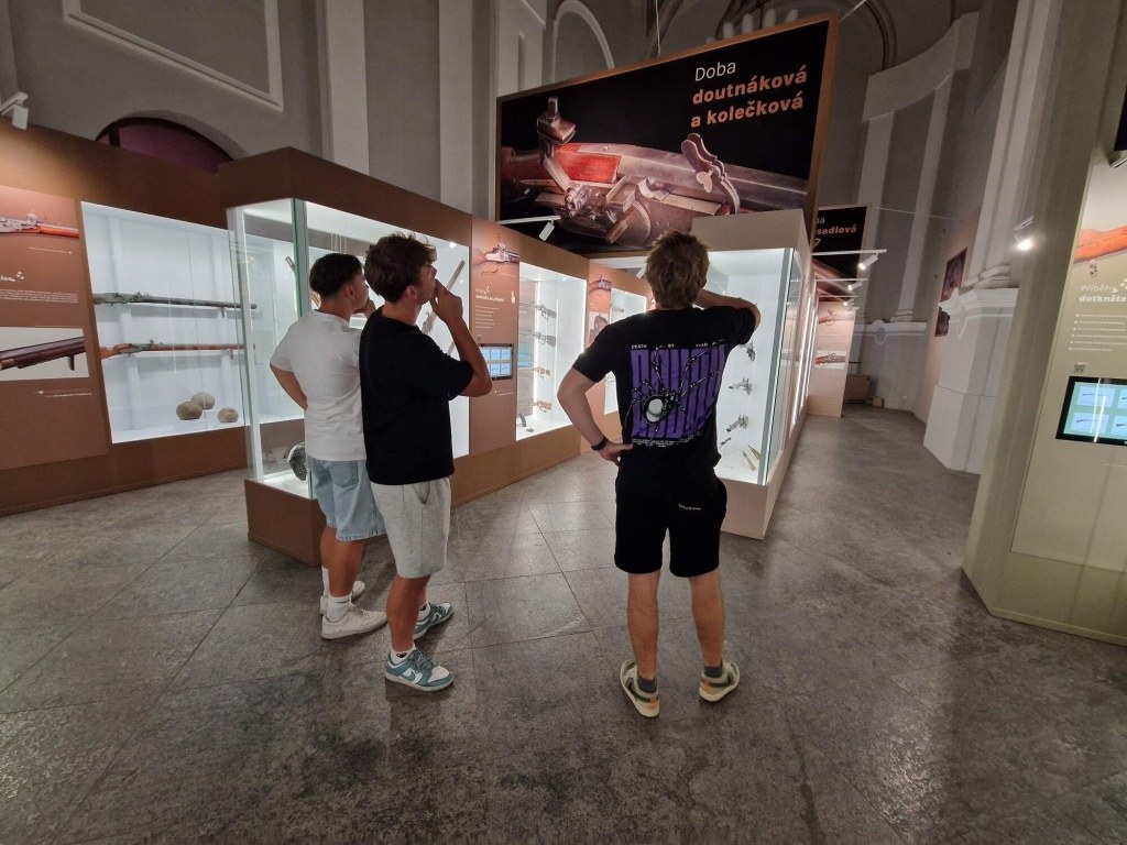 Žáci 2. B se společně s vyučujícími Vendulou Durdovou, Petrou Skalákovou a Kevinem Smithem vypravili do Olomouce, aby v hanácké metropoli navštívili Vlastivědné muzeum a prohlédli si výstavu Příběhy palných zbraní. Tato výstava byla záměrně, s ohledem na zaměření naší školy, zvolena jako cíl naší třídní akce. Současná exhibice totiž nese podtitul „Obrana – o hodnotách, které nesmíme ztratit“. Expozice obsahovala exponáty od dob třicetileté války až po současnost, včetně podomácku vyrobených zbraní zabavených PČR. Některé z vystavených objektů si bylo možno potěžkat v ruce a dokonce z nich i vystřelit, čehož žáci aktivně využili. Po návštěvě muzea si žáci prohlédli historické centrum Olomouce. Po pěším okruhu městem poté zamířili na vlakové nádraží a přesunuli se zpět do Holešova.