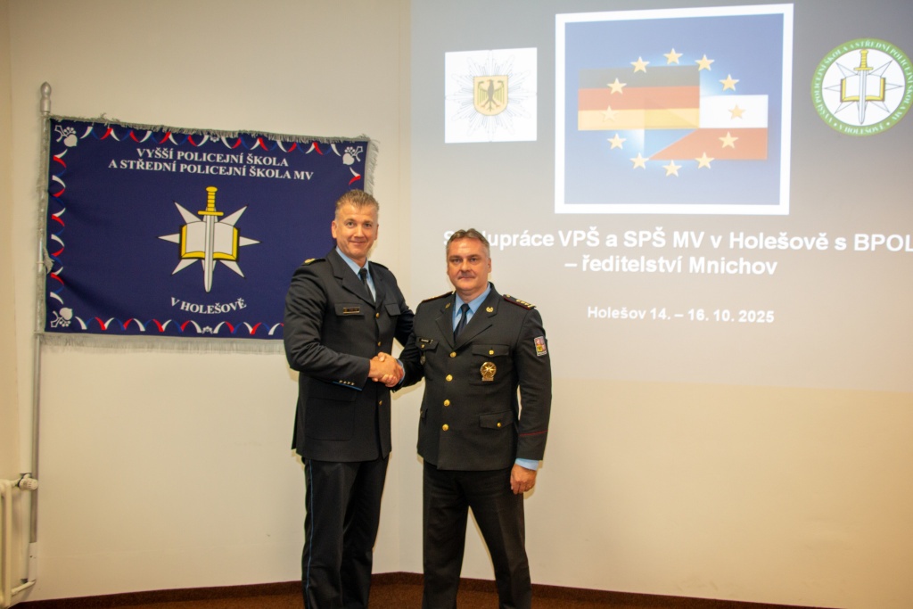 Ve dnech 14. až 16. října 2025 navštívil VPŠ a SPŠ MV v Holešově viceprezident BPOL – ředitelství Mnichov F. X. Vogl spolu s PR Markusem Leitlem ze společného centra ve Schwandorfu. Důvodem bylo pravidelné setkání vedení obou institucí, které spolu spolupracují více jak třicet let. Došlo k vyhodnocení spolupráce za rok 2025 a domluvil se i plán na rok 2026. Ten zahrnuje výuku českého jazyka pro německé policisty, odborné stáže pro učitele školy a studující VOŠ, hospitace pro německé kolegy či výměnnou stáž žáků SOŠ a učitelů ve vzdělávacím centru BPOLu v Bamberku.