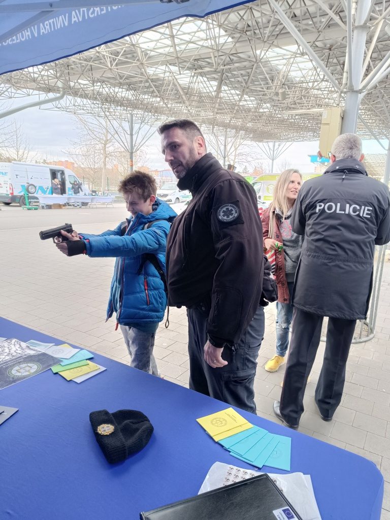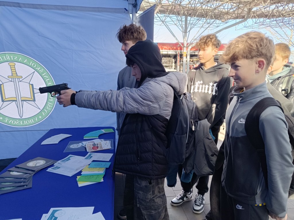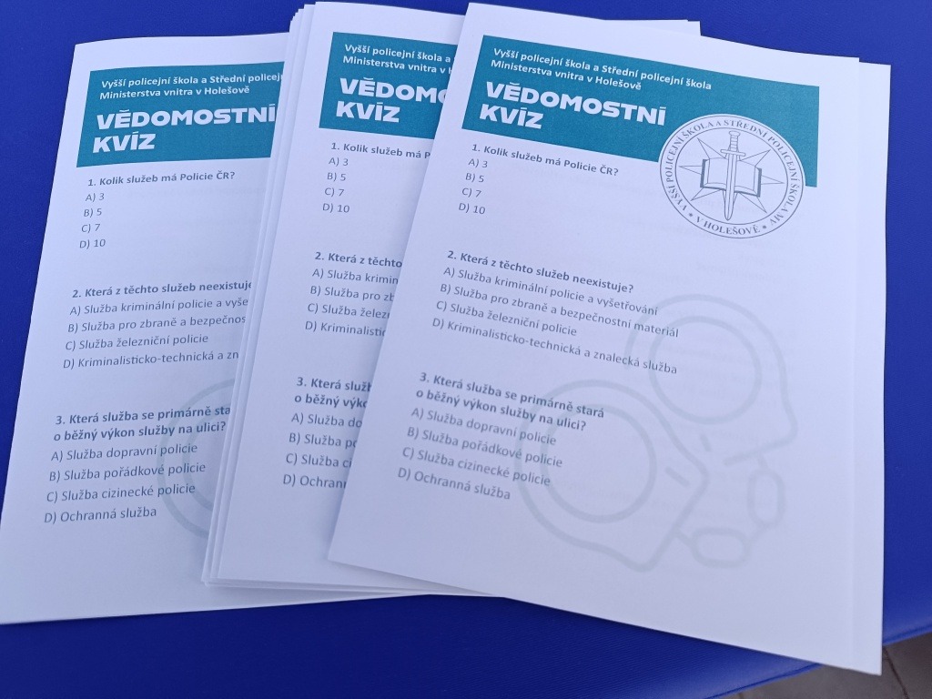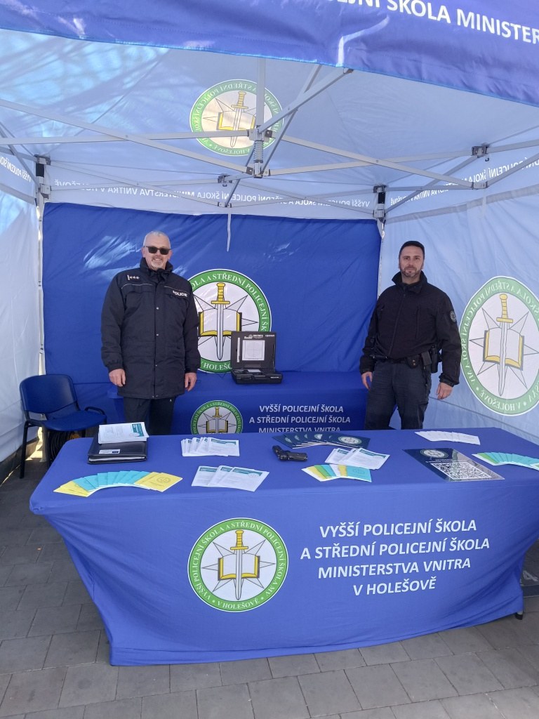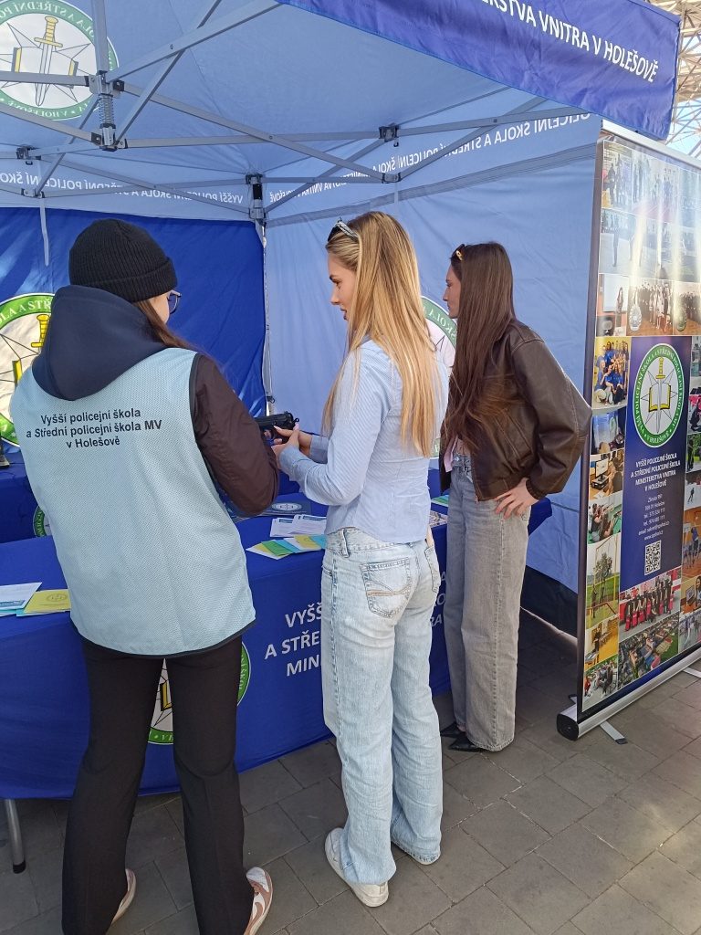 U stánku VPŠ a SPŠ MV v Holešově si mohli žáci vyzkoušet své znalosti o policii v rámci vědomostního kvízu, k dispozici byla i laserová střelnice. Po celou dobu policisté ve složení plk. Mgr. et Mgr. Petr Benda, pplk. Mgr. Eva Vichlendová a kpt. Ing. Bc. Josef Bednařík podávali informace o vzdělávání na střední odborné škole. Velmi nápomocní byli i žáci a žákyně střední odborné školy ze třetího a prvního ročníku Monika Bröcklová, Vítek Suchánek a Natálie Křížková, Stanislav Tomek.