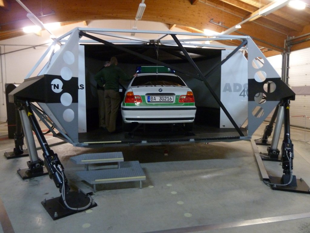 Na konec pobytu nám p. Piehler zařídil prohlídku simulátoru jízd a zkušební jízdu v něm. Simulátor se skládal z obrovské kupole, v níž bylo uloženo auto, které bylo napojeno na monitory a na program, který simuloval jízdu jakýmkoli terénem a jakékoli dopravní situace.