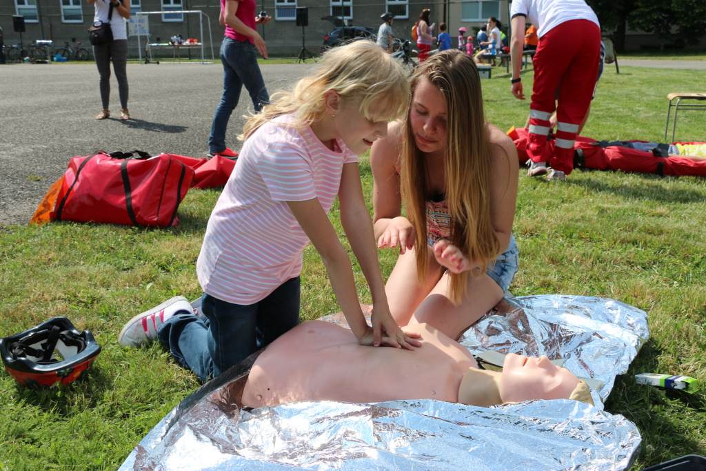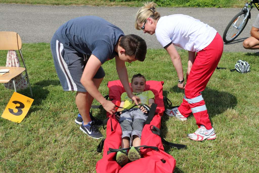 Děti, ale i někteří odvážní rodiče, si vyzkoušeli jízdu zručnosti na kole či koloběžce, postup při resuscitaci osoby, transport zraněného a ošetření lehkého zranění způsobeného pádem z kola.