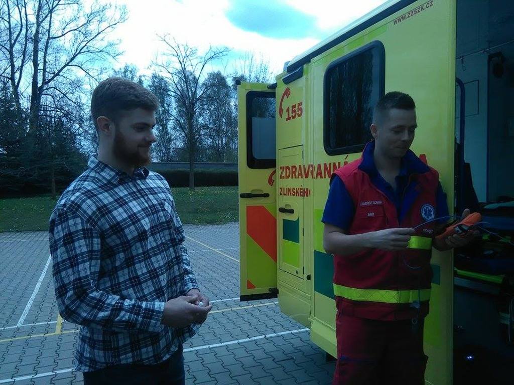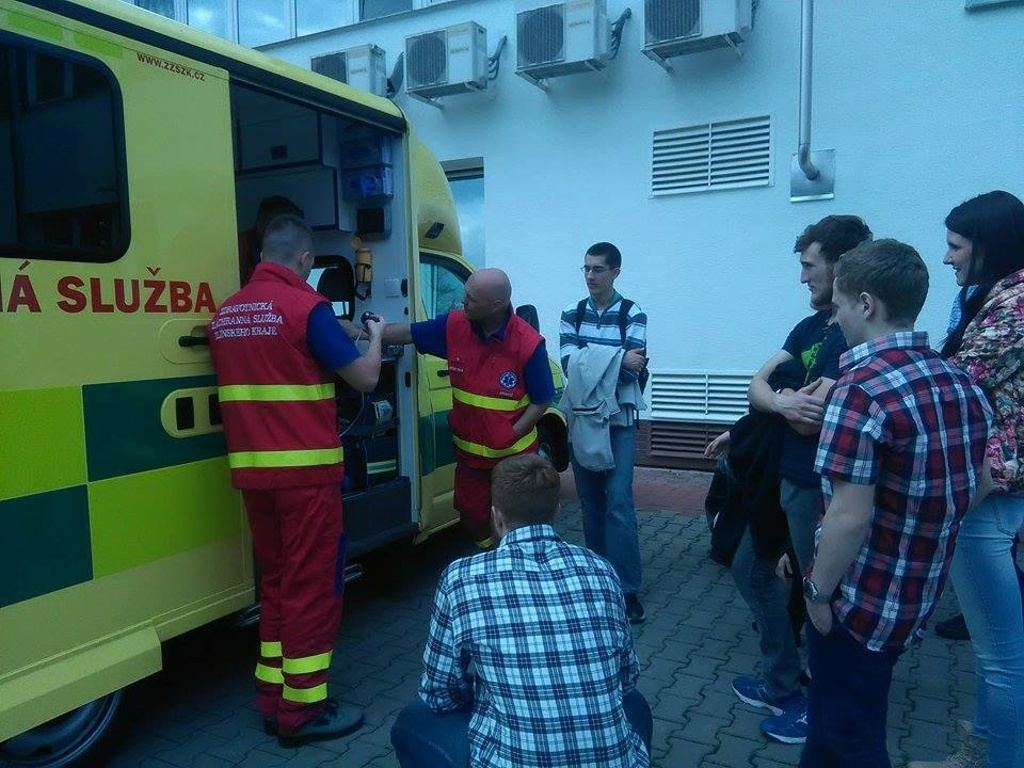 V prostorách vozového parku Zdravotnické záchranné služby bylo studentům umožněno prohlédnout si interiér vozidla určeného pro výjezdy rychlé lékařské pomoci. Jedná se o vozidlo Volkswagen Transporter T5 s kufrovou nástavbou, ve které jsou umístěny potřebné přístroje, nástroje a medikamenty, důležité pro poskytnutí adekvátní pomoci a záchrany života. Některé z přístrojů zjišťující základní životní funkce si mohli studenti vyzkoušet i osobně. Dále vedoucí lékař MUDr. Marek Obrtel poskytl všeobecné informace týkající se spolupráce s ostatními složkami integrovaného záchranného systému a popsal postup záchranářů od okamžiku přijetí oznámení o zranění osoby, po okamžik poskytnutí pomoci zraněnému.