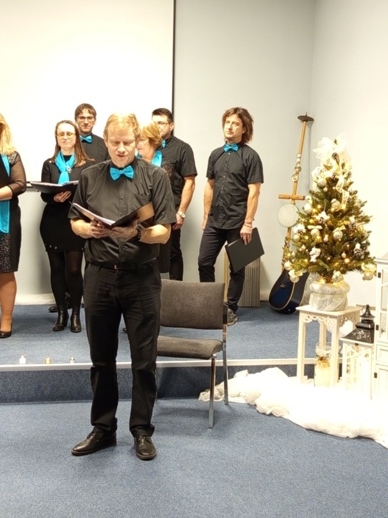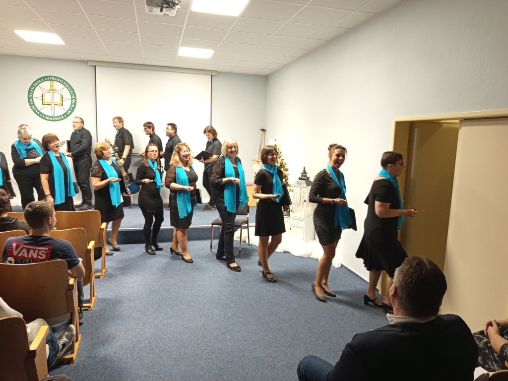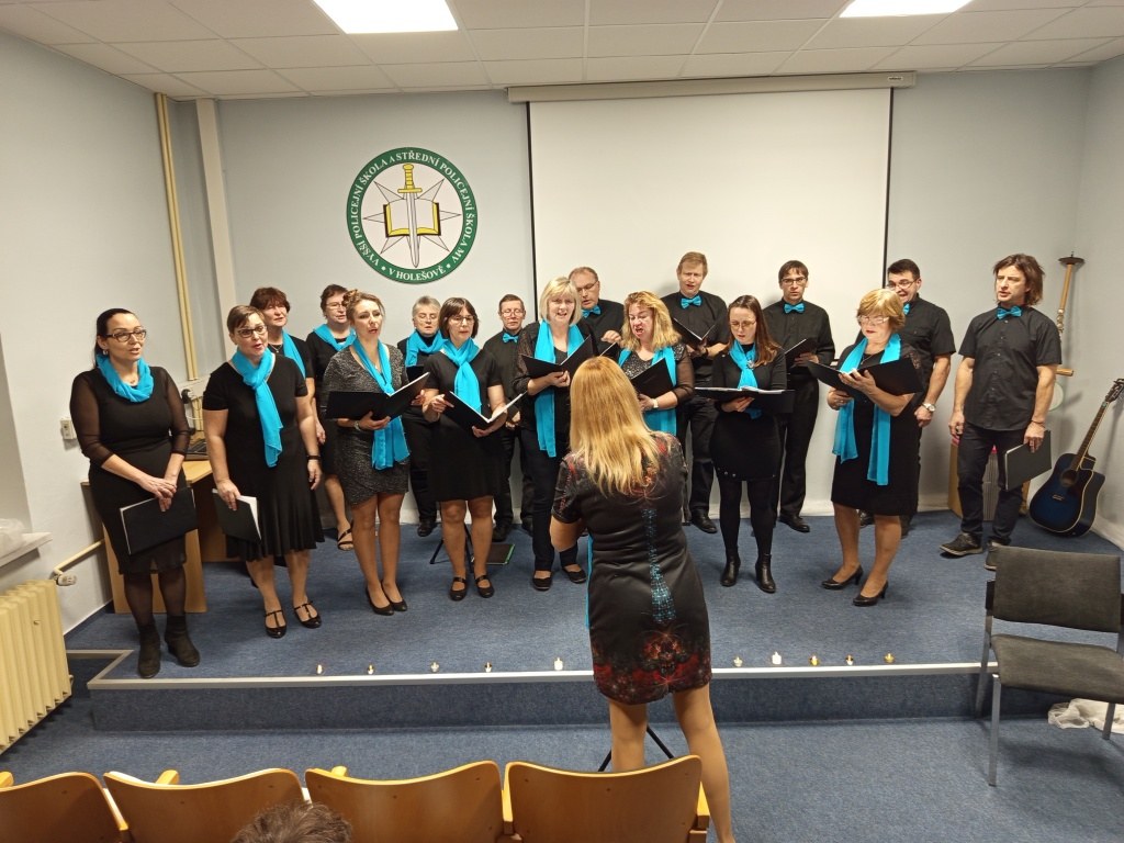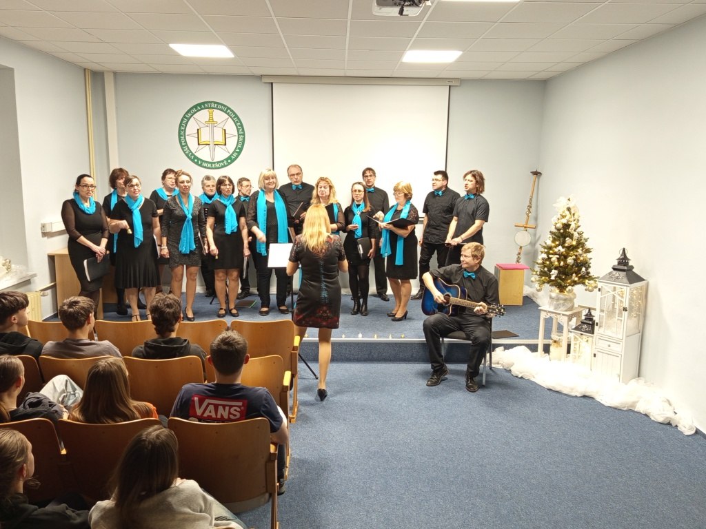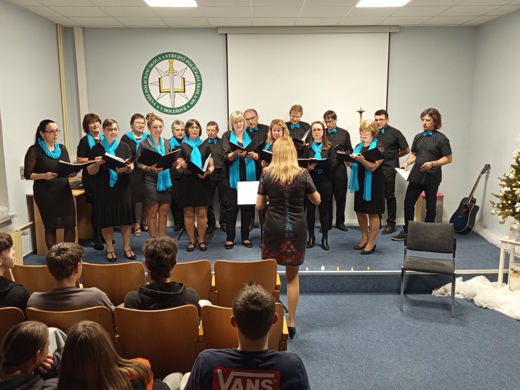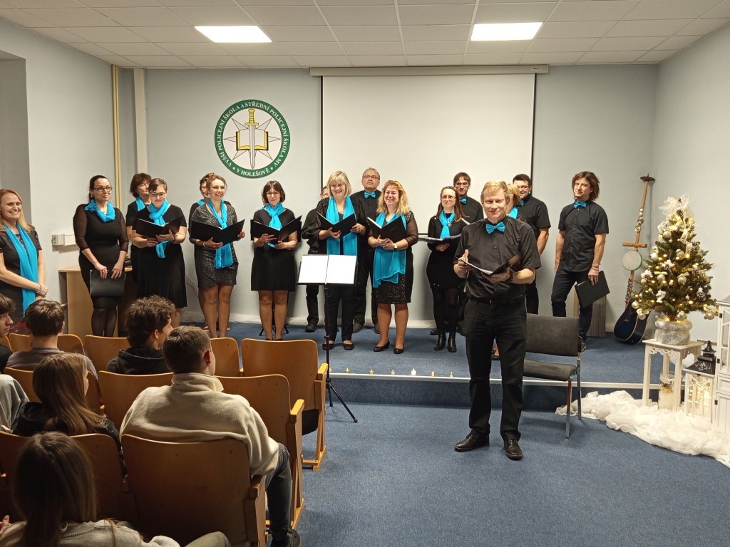Nastal čas předvánoční a s ním přišel první adventní týden. Advent znamená příchod. K nám přišel v úterý 3. 12. 2024 v podobě smíšeného pěveckého sboru Harmonia z Hranic. Nádherný hudební zážitek umocněný vánoční světelnou výzdobou v zasedací místnosti budovy B-1 si společně užili žáci i hosté z řad zaměstnanců školy.