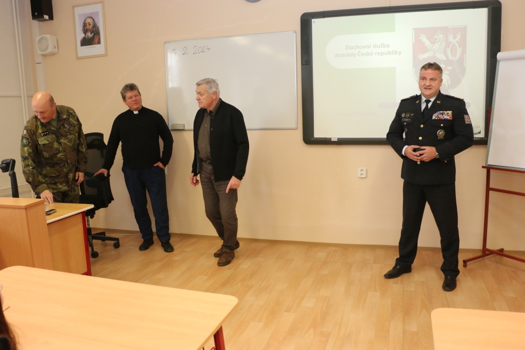 V rámci semináře „Mravní a křesťanská výchova“, který se konal 14. února 2024, proběhla beseda s hlavním kaplanem Duchovní služby Armády České republiky plk. gšt. Mgr. Jaroslavem Kníchalem.