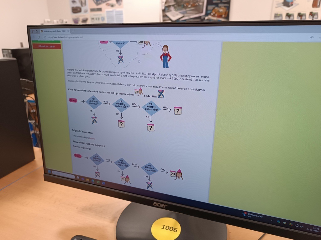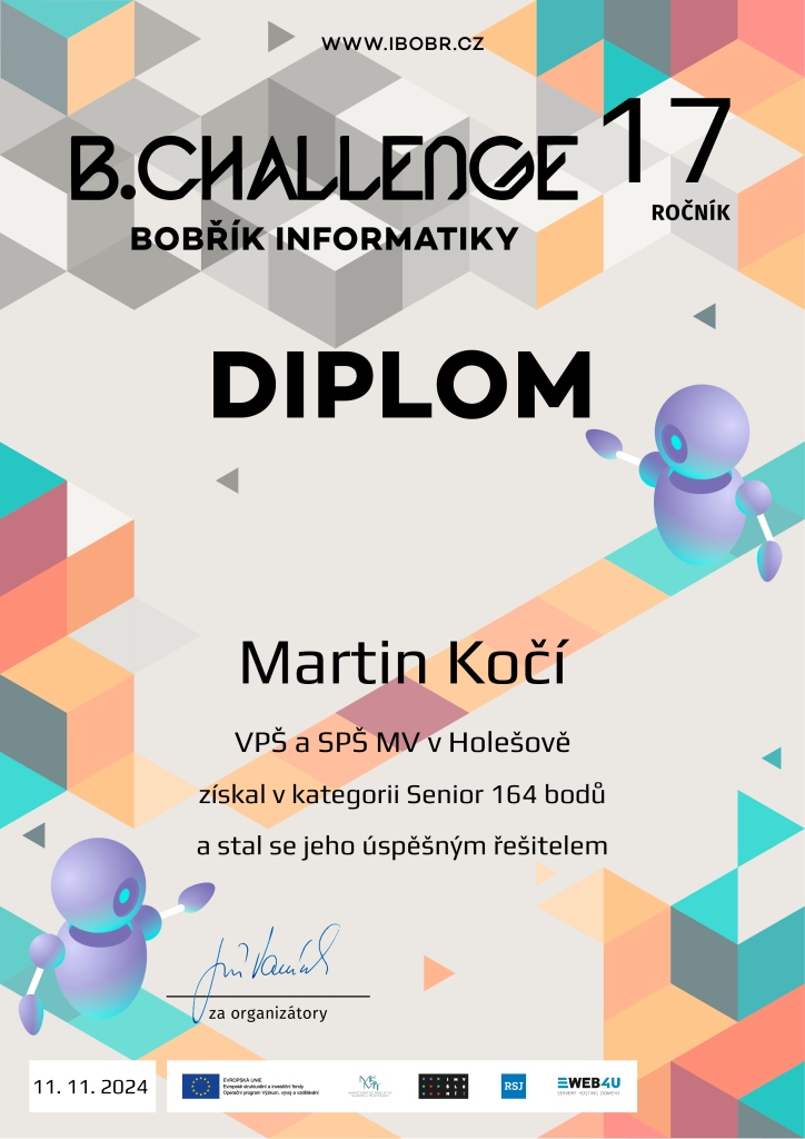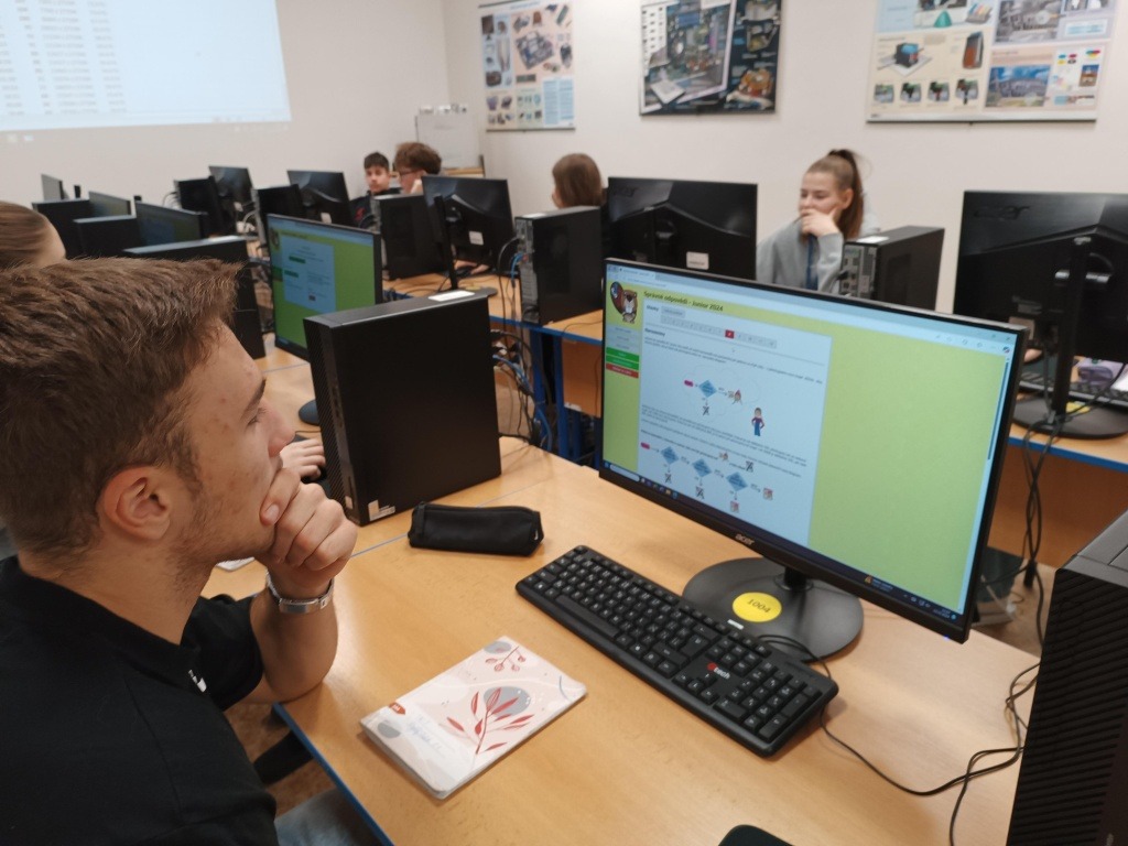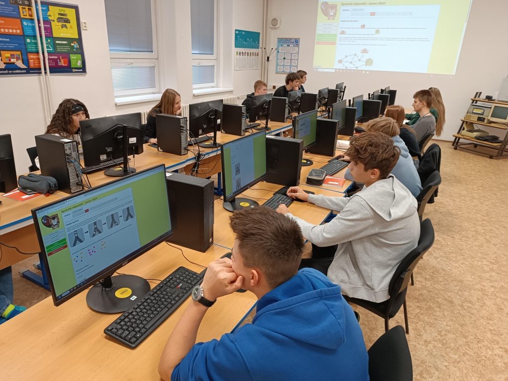 Ve dnech 4. 11. – 15. 11. 2024 se opět uskutečnila celostátní soutěž „Bobřík informatiky“ a žáci naší školy se jí už tradičně zúčastnili v hojném počtu. Tato předmětová soutěž, podporovaná MŠMT, je organizována v pěti věkových kategoriích pro žáky od 4. ročníku ZŠ až po maturitní ročník SŠ a nevyžaduje žádné speciální znalosti z informatiky. Cílem soutěže je poskytnout zájemcům o počítače platformu pro porovnávání svých znalostí, popularizovat informatiku ve školách a modelovat zaměření tohoto školního předmětu od konzumování informačních technologií směrem k základům odborné informatiky.