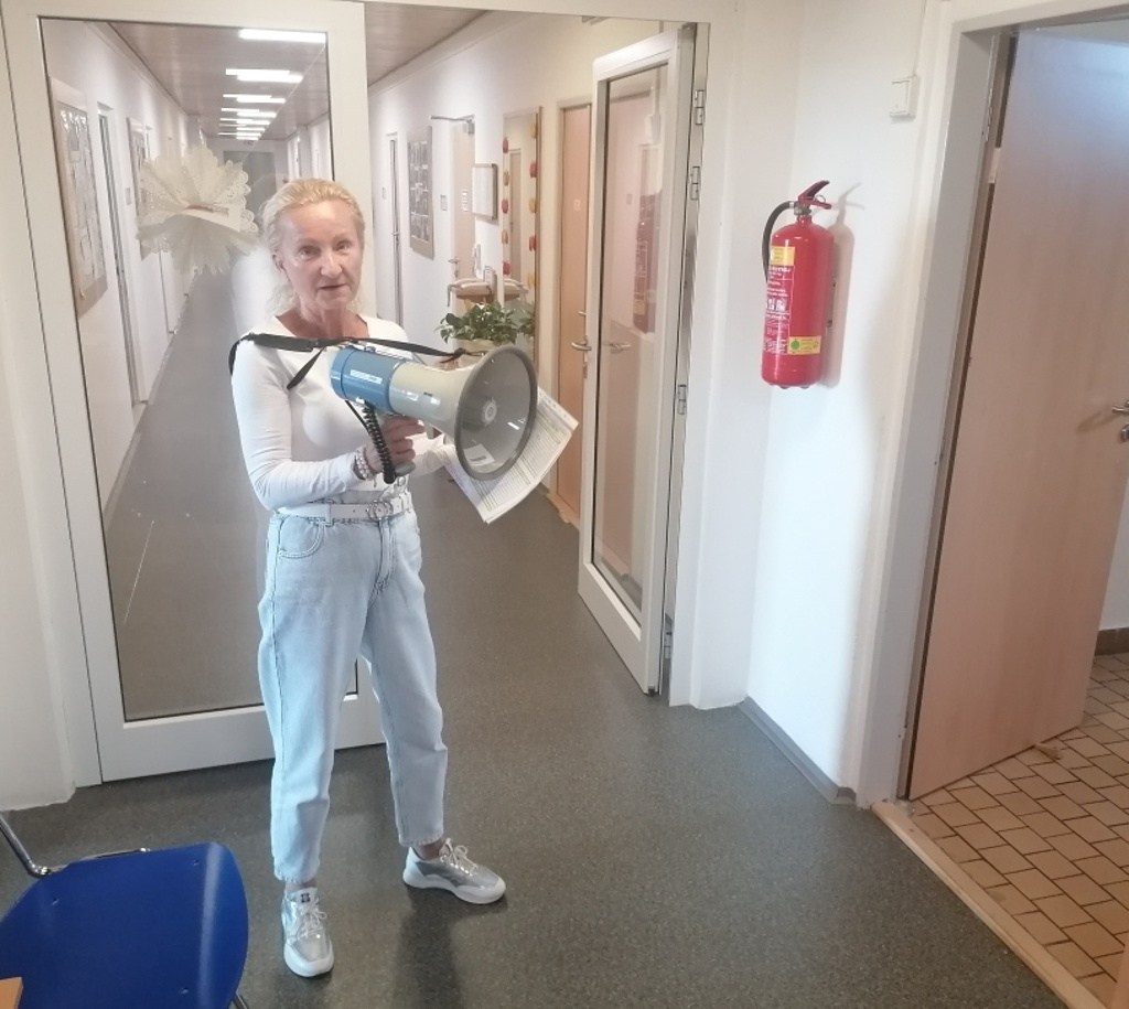 Praktický nácvik proběhl v prostorách čtvrtého patra internátu. Pro vytvoření reálnějších podmínek, čekali žáci na vyhlášení evakuace na zavřených pokojích. Vyhlášení evakuace pomocí megafonu se ujala vychovatelka Iva Bělunková, která po odchodu žáků po požárním schodišti zkontrolovala jednotlivé pokoje. Ujistila se, že evakuované patro všichni žáci opustili. Na shromaždišti před školní jídelnou se žáci řadili do tvaru, který je určen při vyhlášení ostré evakuace.