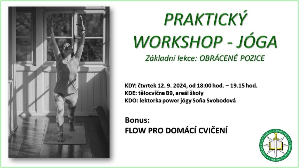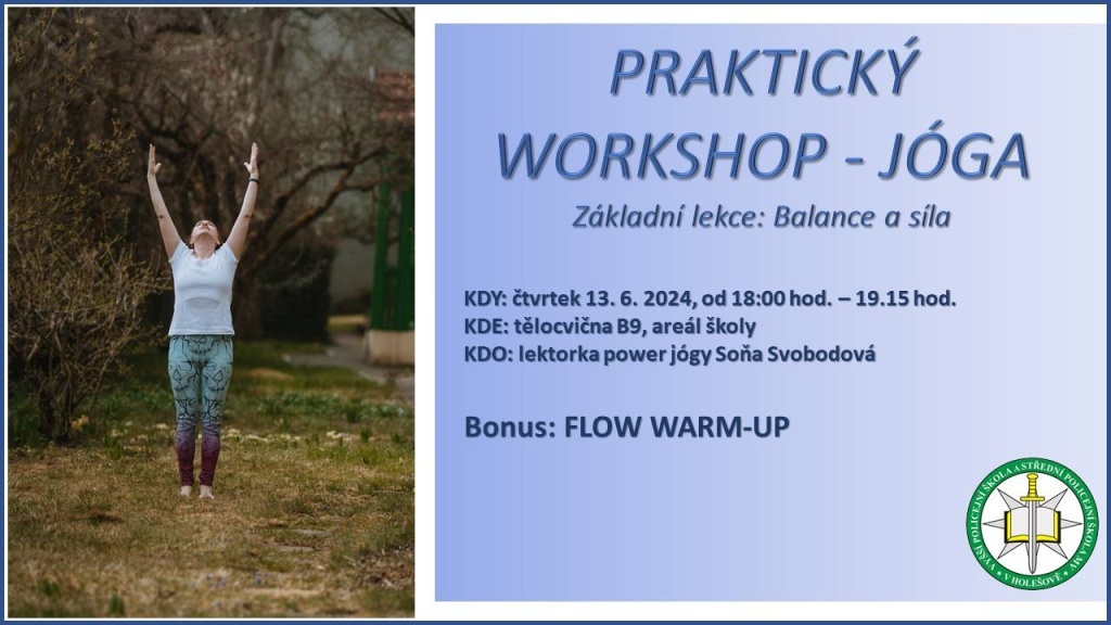 Hodně zdaru s balančními ásanami přeje lektorka a současně vás zve na poslední workshop v letošním školním roce, který proběhne 13. června 2024 od 18 hodin v tělocvičně B9 areálu VPŠ a SPŠ MV v Holešově a cílem setkání bude prohlubování jógové praxe právě v oblasti balance a síly.