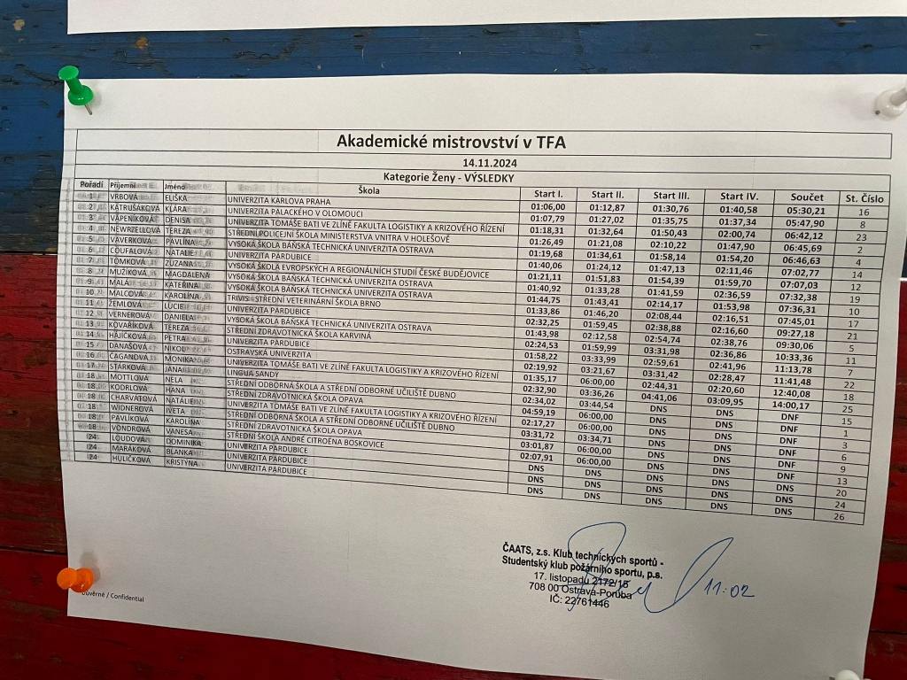 Dne 14. listopadu 2024 se uskutečnilo Akademické mistrovství TFA v Ostravě pořádané Českou asociací akademických technických sportů. Jelikož se jednalo o Akademické MČR, závodníci reprezentovali školy, na kterých aktuálně studují. Tereza nastoupila do soutěže v kategorii žen, to znamená v konkurenci mnohem zkušenějších kolegyň, ale i přesto si vedla velmi dobře. Bohužel při třetím startu došlo ke ztrátě času na překážce „lešení“ a to ji stálo umístění na stupni vítězů. Pouhé 3 vteřiny zaostala za závodnicí na místě třetím. Avšak její konečné 4. místo je zároveň místem prvním mezi středoškolačkami. Další nejlepší středoškolská závodnice se umístila až na desáté příčce.