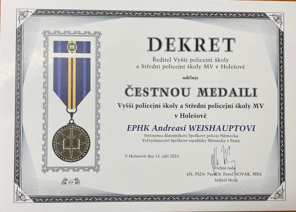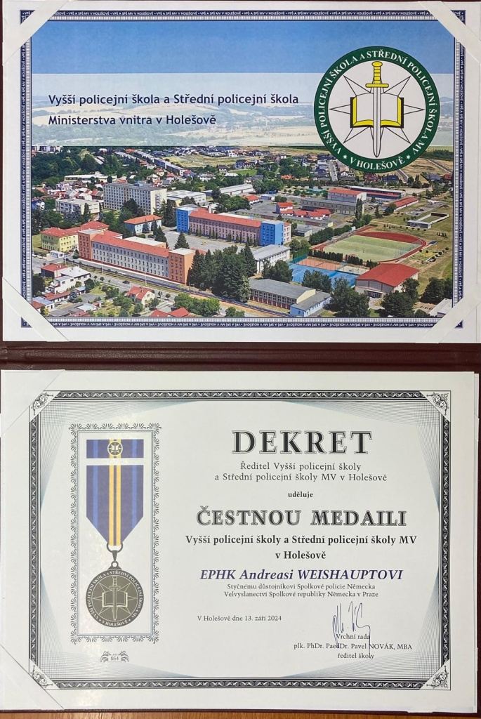 Pan Weishaupt po celou dobu své policejní kariéry s VPŠ a SPŠ MV v Holešově spolupracoval a významnou měrou se zasloužil o rozvoj vztahů mezi školou a Spolkovou policií Německo – ředitelství Mnichov.