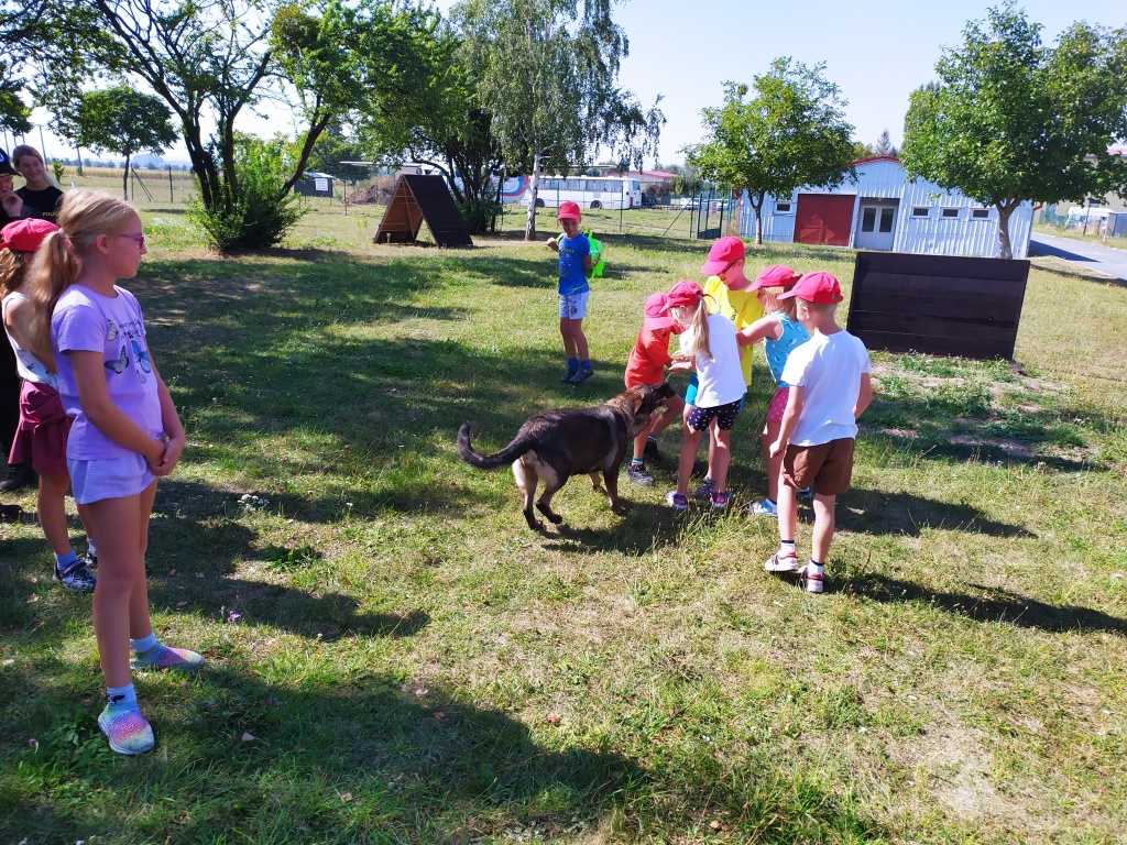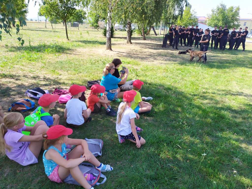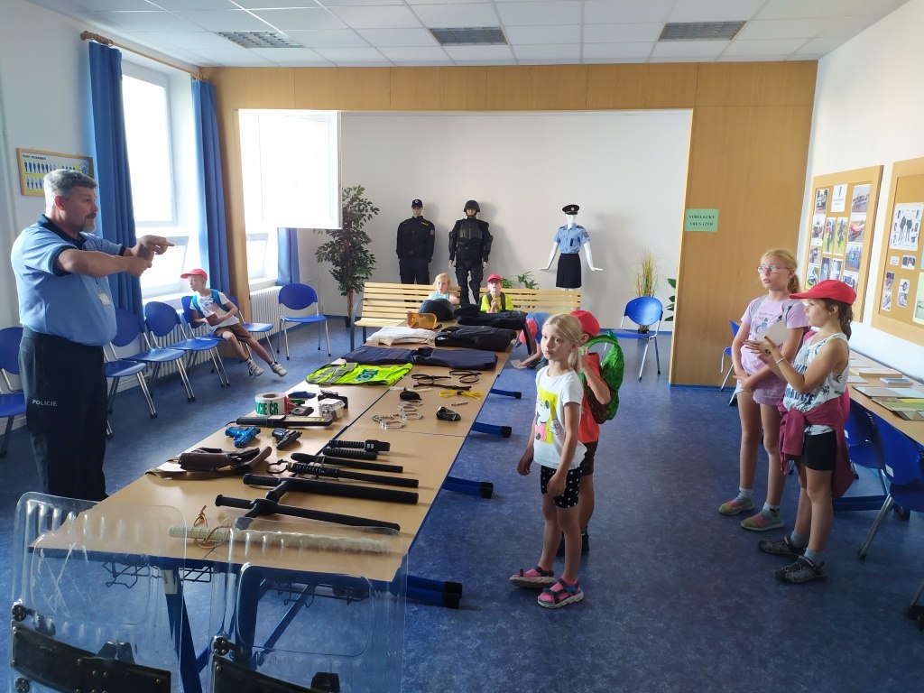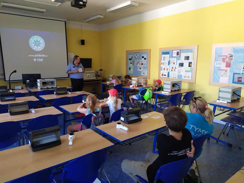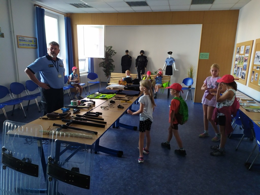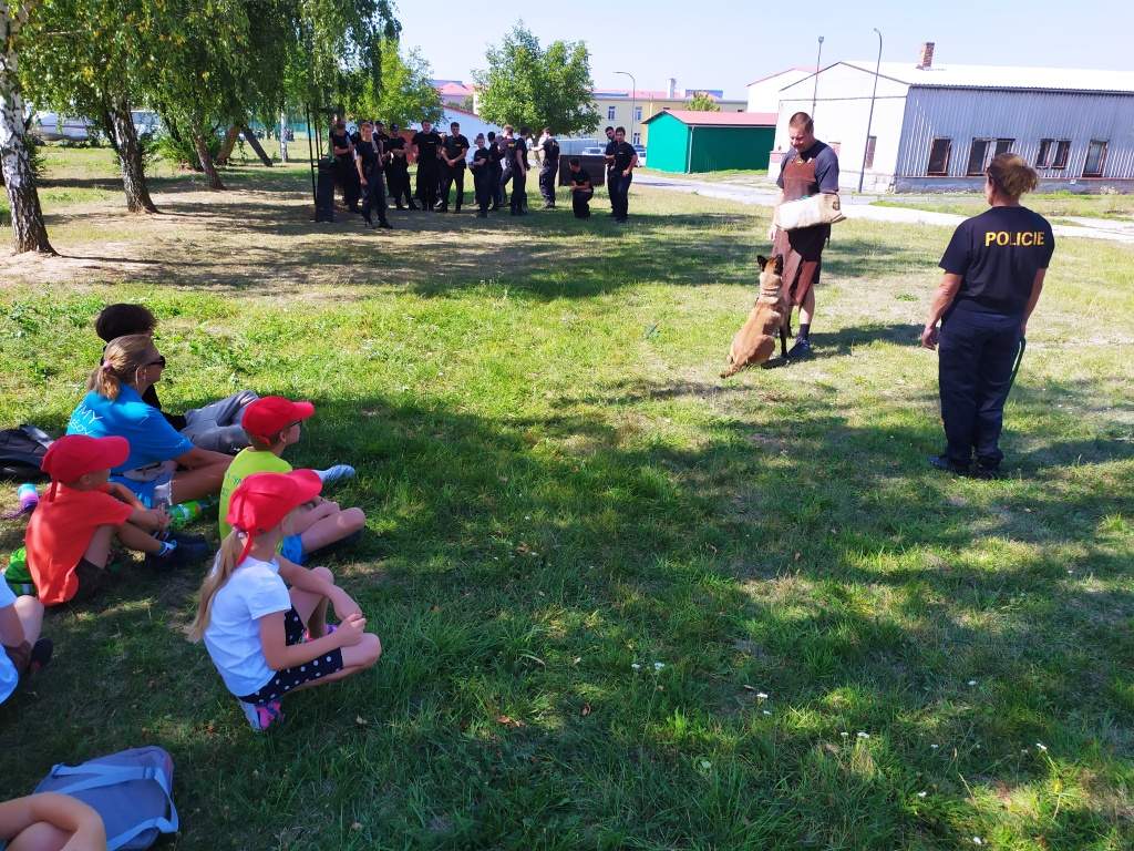 Jako součást programu příměstského tábora, organizovaného Střediskem volného času TYMY v Holešově, se uskutečnila exkurze v naší škole. V pátek 30. srpna malé táborníky a jejich pedagogický dozor nejdříve zaujal kpt. Mgr. Petr Novosád vybranými jistícími prvky českých dokladů a bankovek. Děti neskrývaly překvapení a úžas nad tím, co všechno spatřily díky využití technických prostředků využívaných při kontrole pravosti dokladů. Pod vedením plk. Mgr. Jaromíra Tobiáše následovala ukázka a možnost vyzkoušet si vybrané prostředky využívané především službou pořádkové a dopravní policie. I toto se setkalo s velkým zájmem účastníků a někteří by si nejraději některé z donucovacích prostředků odnesli s sebou domů. Pobyt dětí ve škole zakončili prap. David Polzer a prap. Bc. Barbora Šmahlíková z pracoviště ochrany areálu a krizového řízení VPŠ a SPŠ MV v Holešově, kteří dětem předvedli ukázku výcviku služebních psů. Jako vzpomínku na návštěvu v naší škole si děti odnesly školní cestovní pasy a policejně laděné rozvrhy hodin, které se jim budou jistě na začátku nového školního roku hodit.