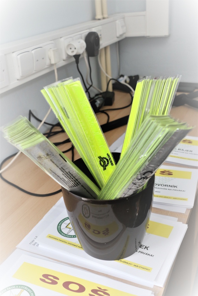 2. září 2024 nastoupily do školy 4 třídy nových žáků, kteří rovněž obdrží reflexní prvky, aby byli lépe chráněni při pohybu ve městě. Celkem 120 reflexních pásků bude rozdáno prvním ročníkům hned na začátku školního roku. Děkujeme krajskému koordinátorovi BESIP Zdeňkovi Patíkovi, který se školou aktivně na prevenci v dopravě spolupracuje.