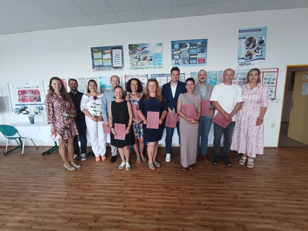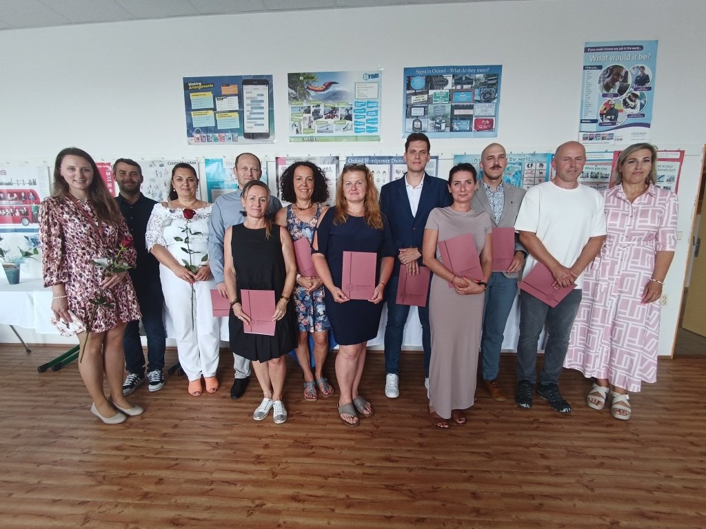 Zodpovědná příprava se vyplatila a 27. června jsme mohly všem devíti uchazečům předat s čistým svědomím osvědčení stvrzující, že jejich jazyková úroveň je A2, u mnohých i vyšší. Díky úspěšnému složení Zkoušky Ministerstva vnitra A2 se absolventům otevírá možnost nastoupit ke studiu v kurzu Zkouška Ministerstva vnitra B1. Čtyři policisté této možnosti využili, v příštím školním roce se budeme v kurzu vídat.