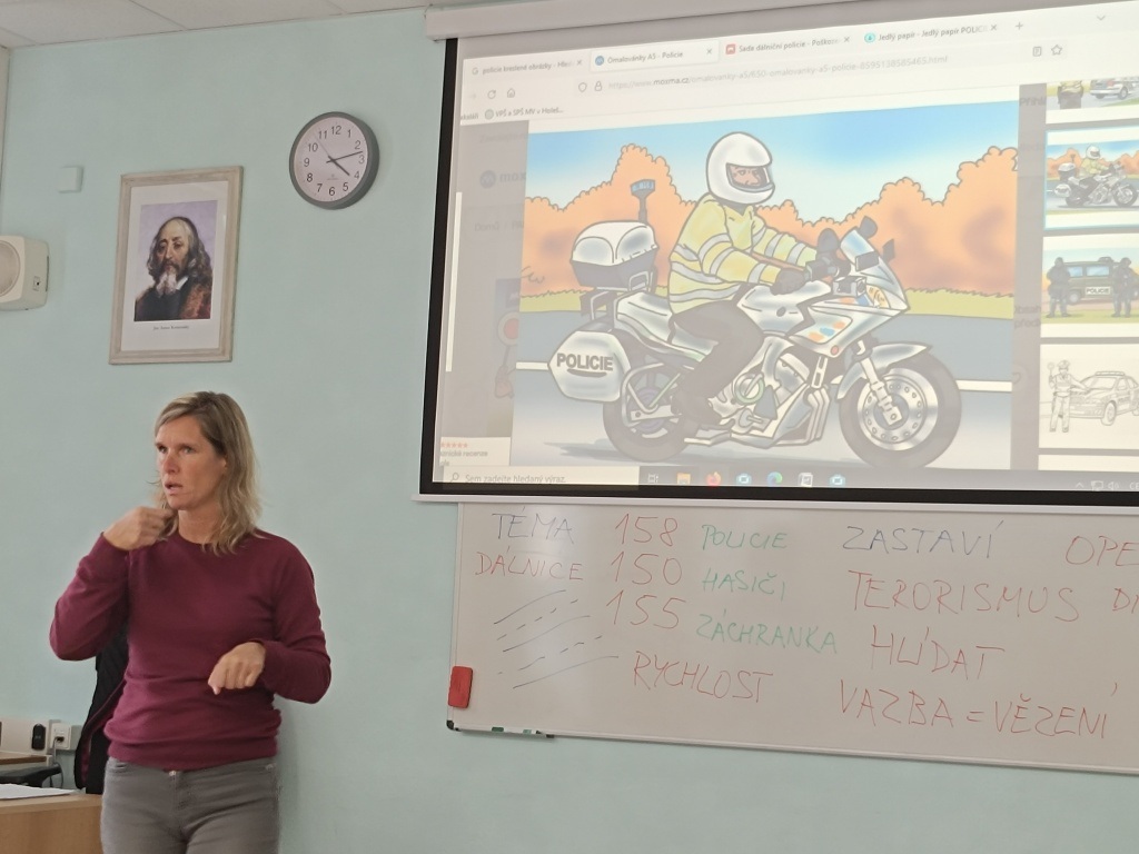 Učebnici žákům poskytla škola ve spolupráci s lektorkou. Kromě základů jako je prstová abeceda, mimika v projevu českého znakového jazyka, slovesa, protiklady, barvy číslovky či hodiny, jsou do ní včleněna i témata jako dopravní prostředky, zdravotnictví, policejní tématika a odborné policejní výrazy. Oblast policejní představuje hlavně policejní terminologie, potřebné fráze v komunikaci s neslyšícími nebo přivolání pomoci. Účastníci kurzu se učili také popsat policejní stanici, dopravní prostředky policie, jednoduché úkony, které policie zajišťuje např. zastavení vozidla a zkouška na alkohol, zjišťování totožnosti, měření rychlosti, dopravní nehoda, zadržení, vzetí do vazby aj. Trénovali základní otázky: „Co se stalo?, Jak se jmenujete?, Jste zraněný?, Potřebujete doktora?, Kde bydlíte?, Koho chcete kontaktovat? nebo Komu mám dát vědět?“ I když byla výuku náročná, žáky nesmírně bavila.