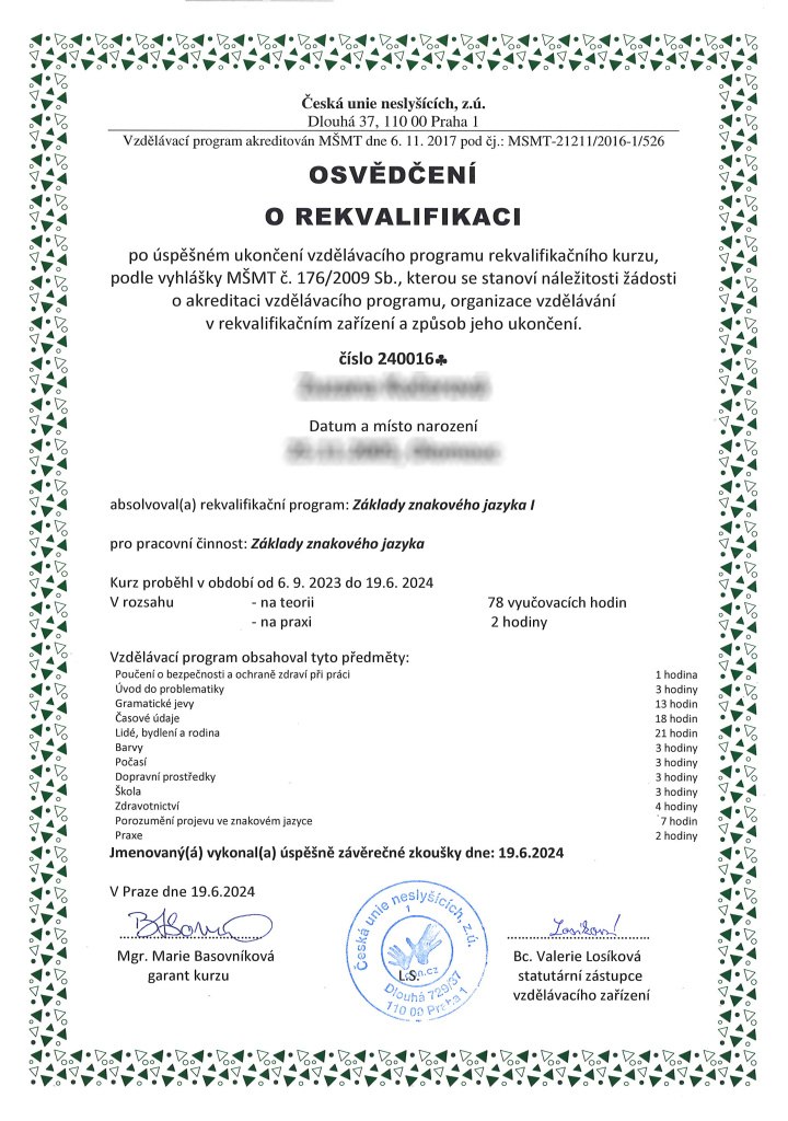 Závěrečná zkouška se skládala z popisu sebe sama ve znakovém jazyce, popisu obrázku a čtení vět ve znakovém jazyce a proběhla ve třech termínech v květnu a v červnu. Z 38 účastníku kurzu se ke zkoušce dostavilo 36. Další dva žáci zkoušku z osobních důvodů přesunuli na podzimní termín. 36 úspěšných absolventů obdrželo Osvědčení o rekvalifikaci, které je akreditováno Ministerstvem školství, mládeže a tělovýchovy. Toto osvědčení potvrzuje, že absolvent zná základy znakového jazyka v rozsahu uvedeném v programu kurzu a umí je využívat v komunikaci s neslyšícími. Díky tomu může dotyčný pomáhat při zprostředkování komunikace mezi neslyšícími a slyšícími lidmi.