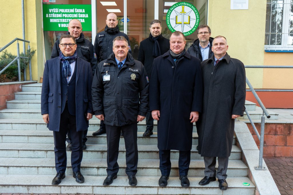 Ve středu 5. února 2025 navštívil areál VPŠ a SPŠ MV v Holešově vrchní ředitel sekce vnitřní bezpečnosti a policejního vzdělávání PhDr. Jan Paďourek, Ph.D. Dalšími členy delegace byli Mgr. Pavel Vařeka, ředitel kanceláře vrchního ředitele sekce, Ing. Bc. Luděk Michálek, Ph.D., ředitel odboru bezpečnostního výzkumu a policejního vzdělávání a vrchní ministerský rada Mgr. Bc. Václav Jarý, vedoucí oddělení policejního vzdělávání a autorizací.