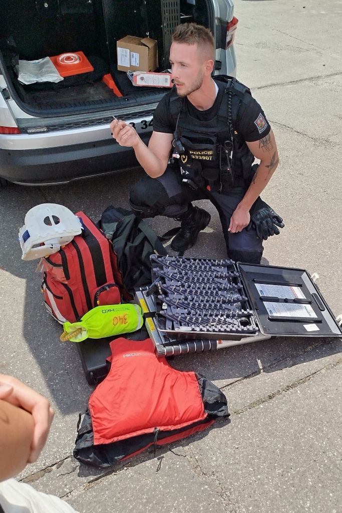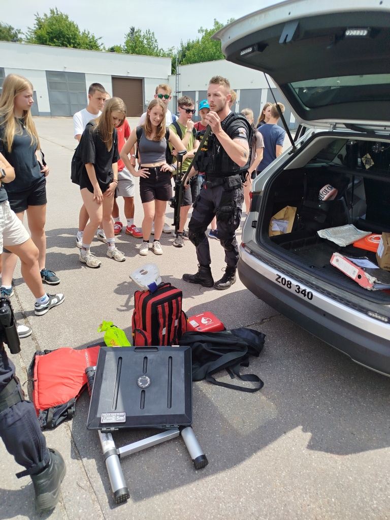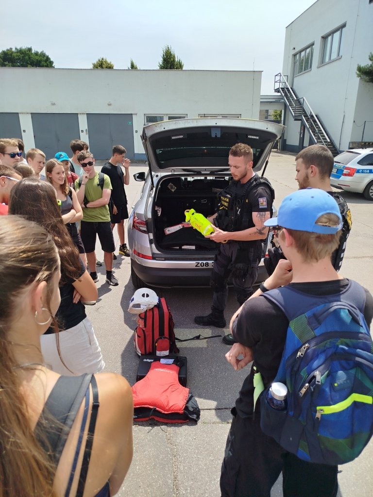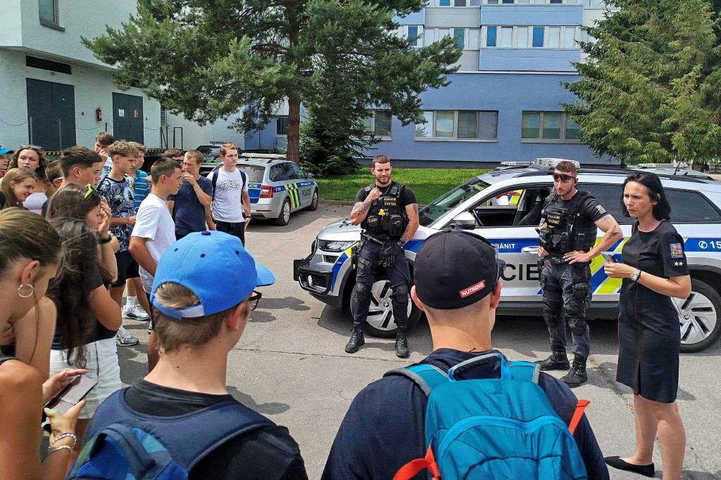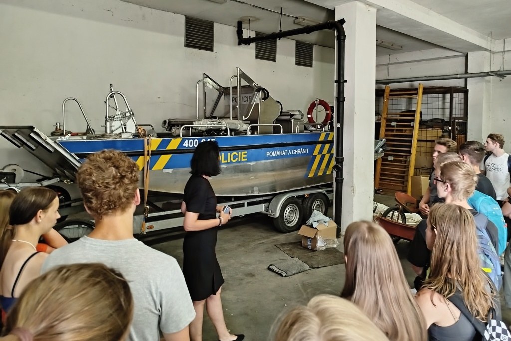 Program exkurze byl zakončen návštěvou Obvodního oddělení Policie České republiky v Uherském Hradišti. Studenty zde přivítala por. Bc. Milena Šabatová pracující jako preventista KŘ P Zlínského kraje, která velmi srozumitelným a poutavým způsobem představila každodenní chod policejní služby. Mimo popisu organizační struktury a náplně práce policie se věnovala také hodnotám, které jsou s tímto povoláním neodmyslitelně spojeny – důvěra, spravedlnost, odpovědnost a etika. Studenty rovněž motivovala k úvahám o své budoucí profesní dráze, a to nejen v oblasti bezpečnostních složek, ale i s ohledem na význam dalšího vzdělávání a celoživotního rozvoje. Nadále byla studentům také představena motorizovaná technika a vybavení policistů. Velmi poutavá byla také rozmluva s prvosledovou hlídkou PČR, která studentům charakterizovala každodenní výkon služby, včetně materiálního vybavení hlídky.