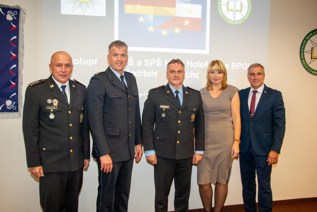 Ve dnech 14. až 16. října 2025 navštívil VPŠ a SPŠ MV v Holešově viceprezident BPOL – ředitelství Mnichov F. X. Vogl spolu s PR Markusem Leitlem ze společného centra ve Schwandorfu. Důvodem bylo pravidelné setkání vedení obou institucí, které spolu spolupracují více jak třicet let. Došlo k vyhodnocení spolupráce za rok 2025 a domluvil se i plán na rok 2026. Ten zahrnuje výuku českého jazyka pro německé policisty, odborné stáže pro učitele školy a studující VOŠ, hospitace pro německé kolegy či výměnnou stáž žáků SOŠ a učitelů ve vzdělávacím centru BPOLu v Bamberku.