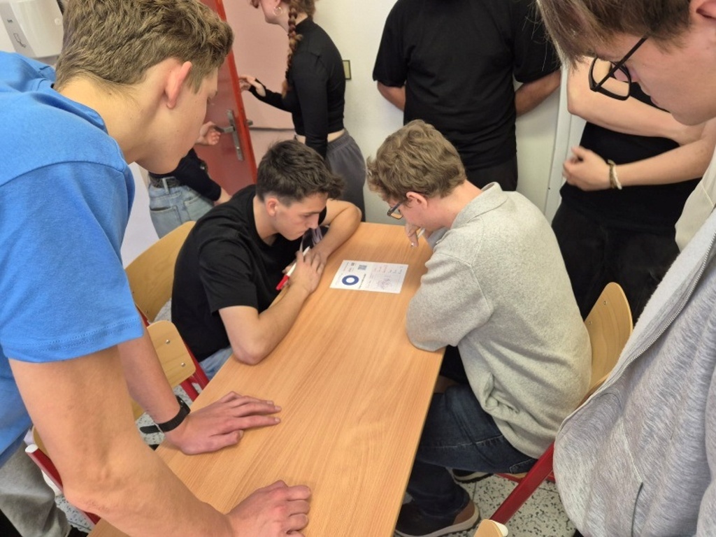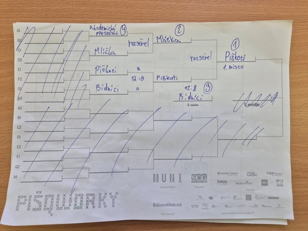 Tento tým byl také jediný, který se letos přihlásil do školního kola, takže automaticky postoupil do Oblastního turnaje konaného 3. listopadu 2025 na OA v Kroměříži. Chlapci jsou v soutěži úplnými nováčky, proto si nedělali velké naděje na úspěch, mohli jen překvapit. A to se také stalo. Po druhém místě v základní části turnaje hrané systémem „každý s každým“ (viz tabulka) zvítězili v semifinále play-off celkem přesvědčivě nad týmem „Bídníci“ (OA Kroměříž) a ve finále svedli souboj s „Mlíčky“ (SŠ mlékárenská KM). Souboj skončil smírně 10 : 10 a tak o celkovém vítězi a postupujícím do Krajského turnaje rozhodla dodatečná partie, ve které kapitán týmu Petr Janota zachoval chladnou hlavu (z hracího plánu je vidět, že soupeři „nedal čuchnout“) a doslova urval vítězství opět pro naši školu.