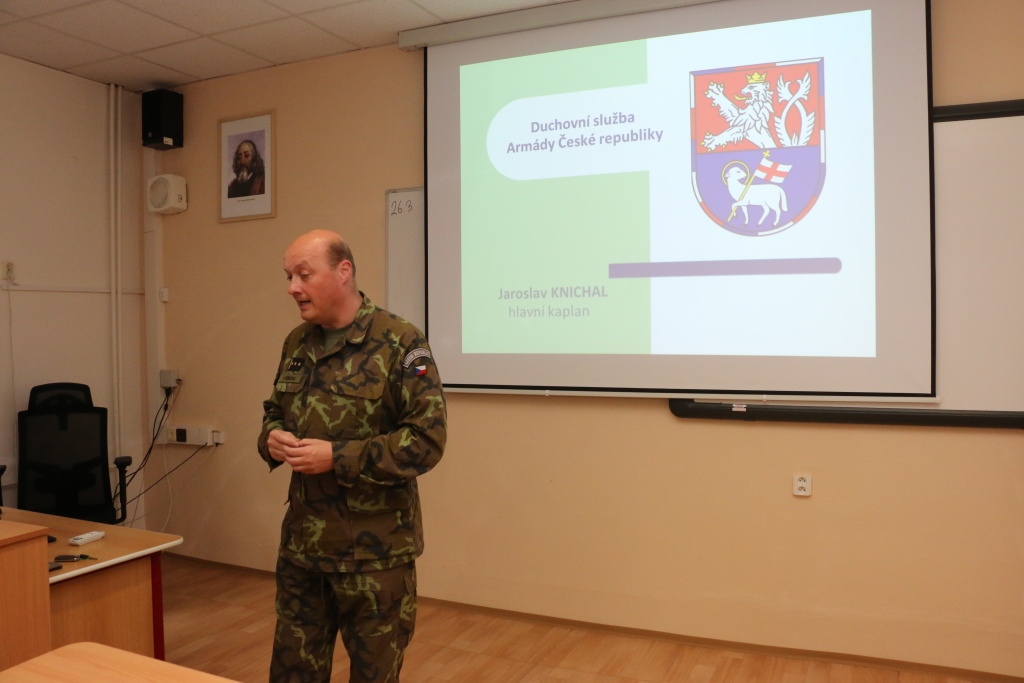 Plk. J. Kníchal z pozice hlavního kaplana Duchovní služby Armády ČR seznámil studenty semináře s historií, organizací, posláním, významem, zaměřením, obsahem a konkrétními příklady činnosti duchovních v armádě. V následné živé diskuzi byly probrány a zdůrazněny otázky významu a morálních aspektů duchovních hodnot ve společnosti a ve světě, včetně aktuálních vojenských konfliktů nejen v Evropě, ale i v celém světě.