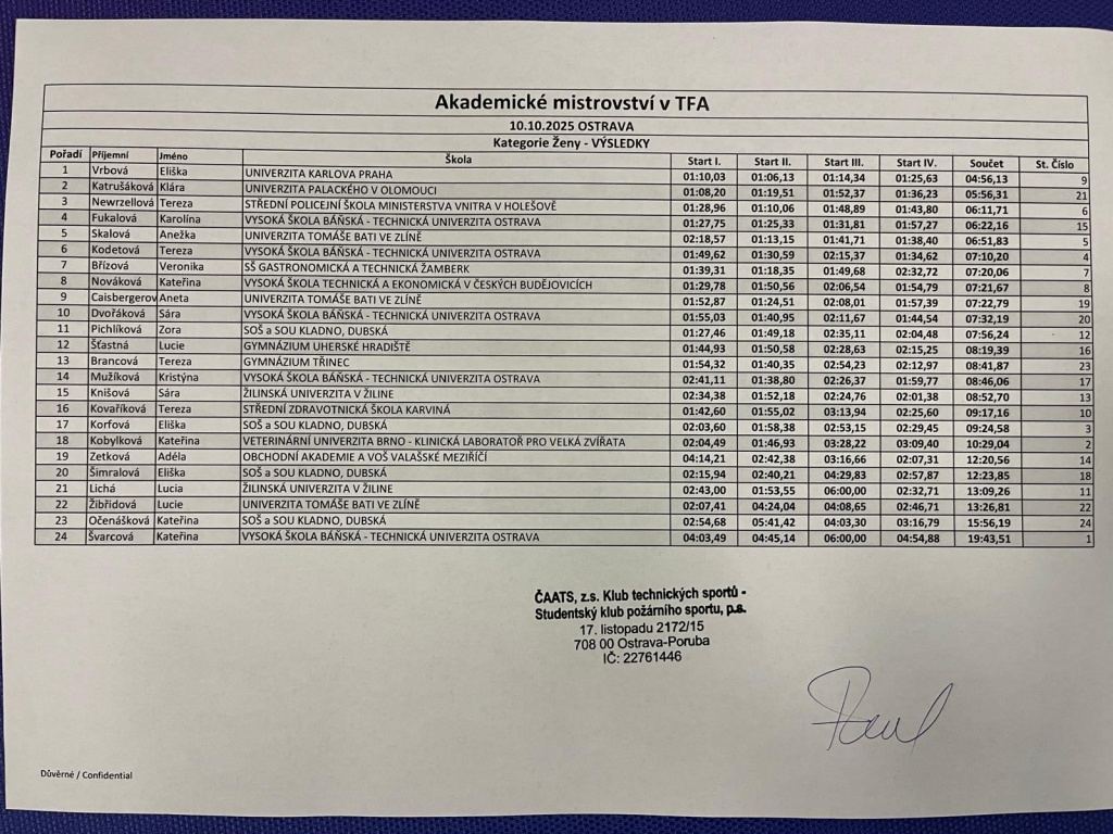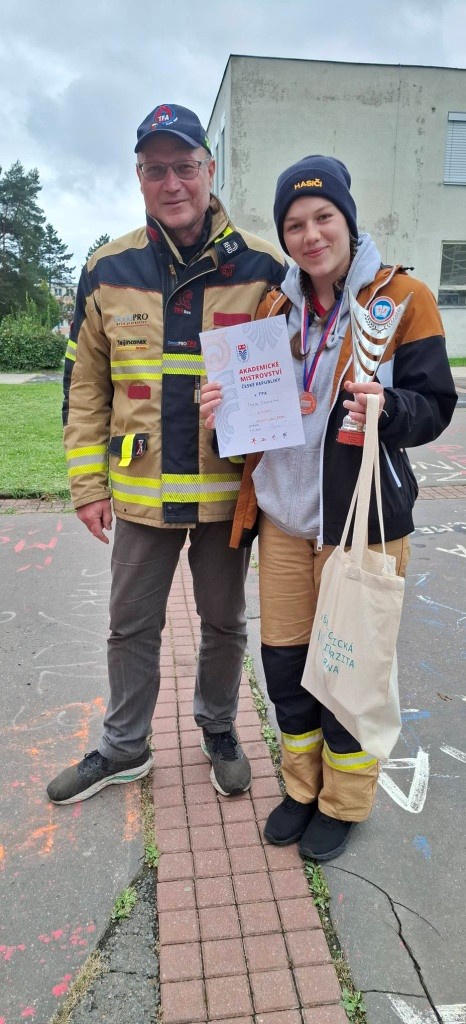Tereza Newrzellová, žákyně 3.B, potvrdila své kvality v hasičských soutěžích TFA (z anglického sousloví Toughest Firefighter Alive). Dne 9. října 2025 se uskutečnilo Akademické mistrovství TFA v Ostravě pořádané Českou asociací akademických technických sportů. Jelikož se jednalo