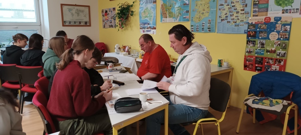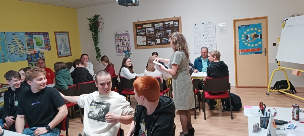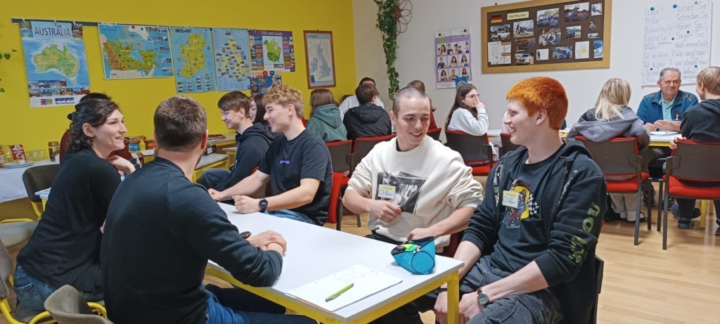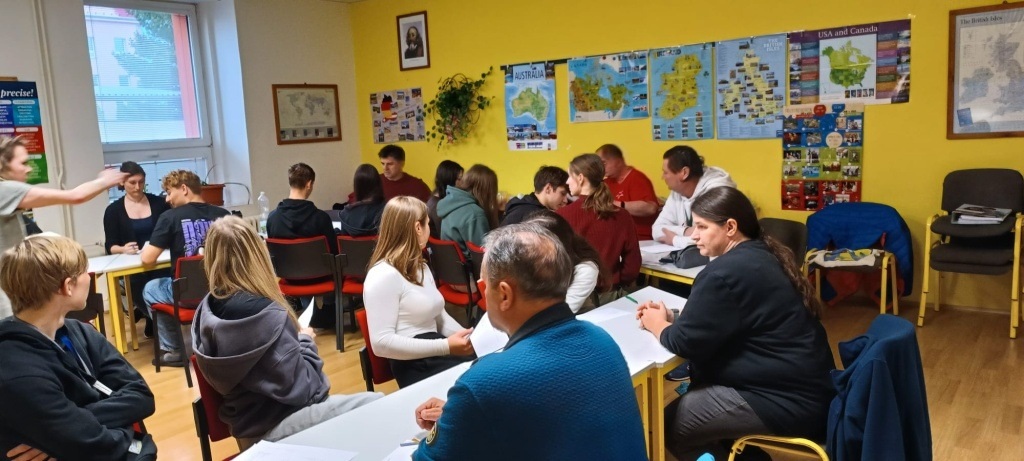 Předposlední den kurzu v naší škole čekala účastníky tandemová výuka s žáky 2. ročníku střední odborné školy. Každému německému mluvčímu byla losováním (pomocí „kola štěstí“) přidělena dvojice našich studentů. Společně se pak zapojili do různých jazykových aktivit. V zahřívací fázi proběhl speed dating neboli „rychlé rande“ – trojice o sobě musela zjistit různé informace podle zadaných kritérií, samozřejmě v jazyce, který se učí. Následně měli náhodně vybraní účastníci prezentovat, co se o svých partnerech dozvěděli. Pokračovalo se modelovým dialogem na zadané téma a kladením losovaných otázek v češtině i němčině, na které bylo třeba pohotově odpovědět.